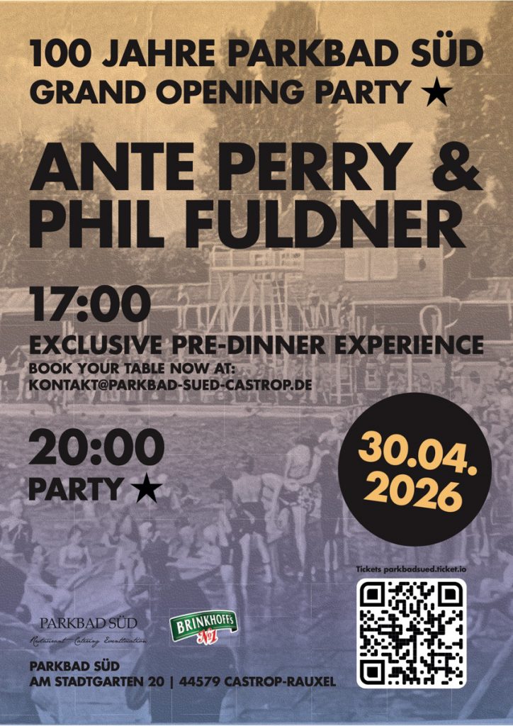 Für den Startschuss am 30.04. werden die DJs und House-Music Stars ANTE PERRY & PHIL FULDNER das beschauliche Parkbad ab 20:00 in einen rauschenden Club verwandeln, und so Musik mit kulinarischem Genuss verbinden, denn bereits ab 17:00 kann man vor der Party noch ein exklusives Dinner in der wunderbaren Atmosphäre unseres Restaurants geniessen: